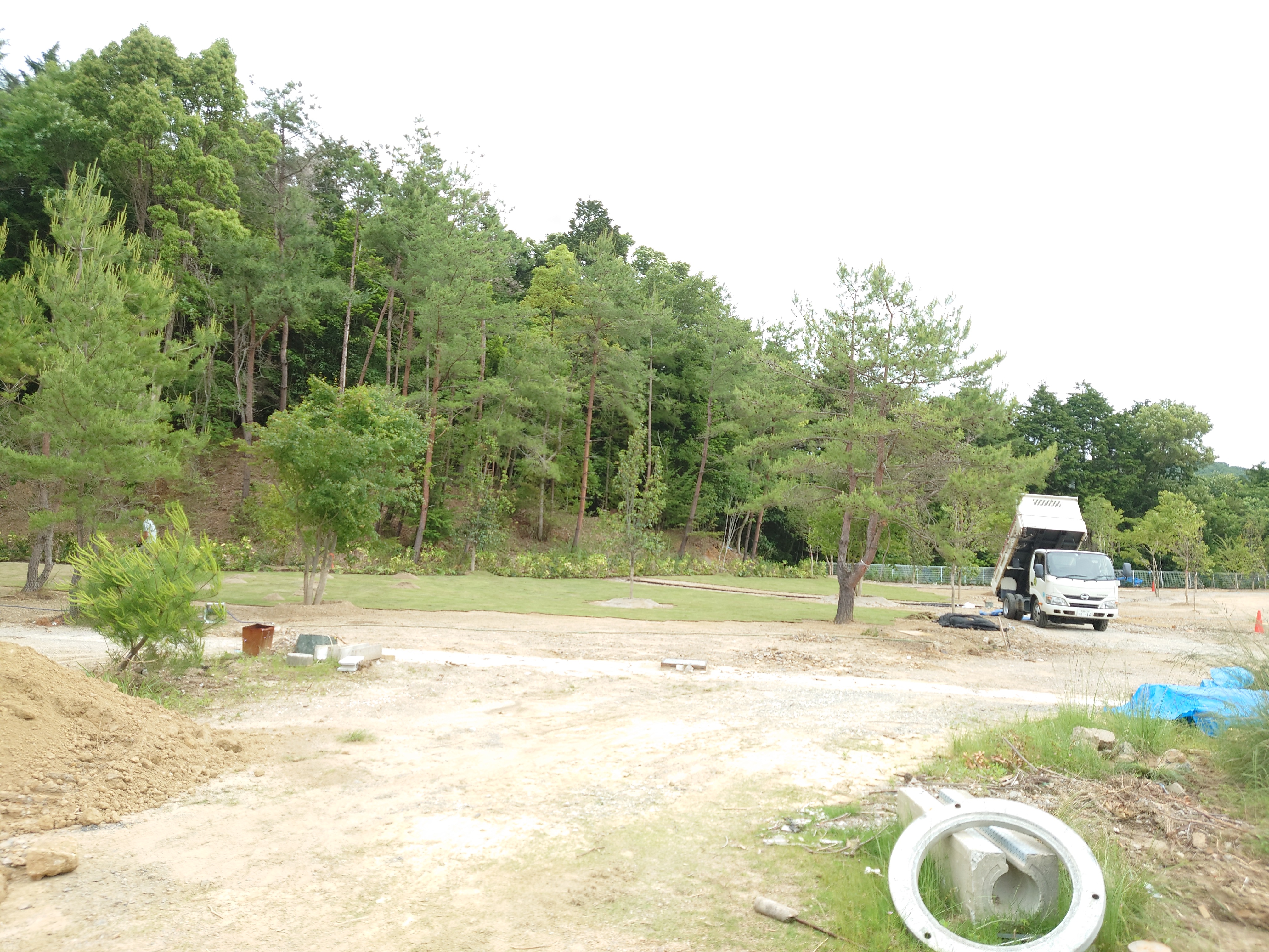 写真の手前は少し、工事の為の資材なんかが残っていて綺麗には見えないかもしれませんが、奥の方は芝が入って随分綺麗に変わっています。